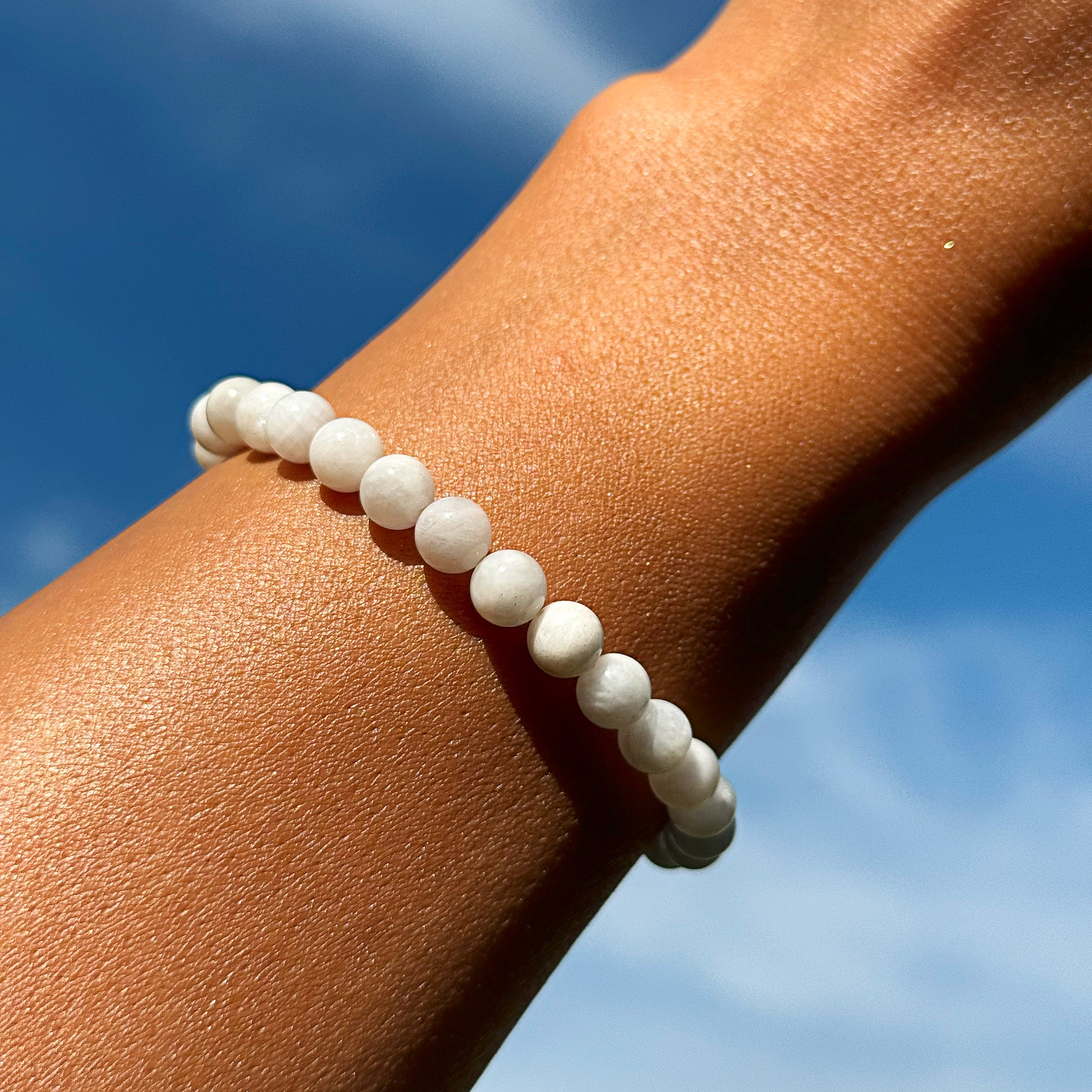 - 6 mm high quality genuine Moonstone gemstone beads on elastic band.