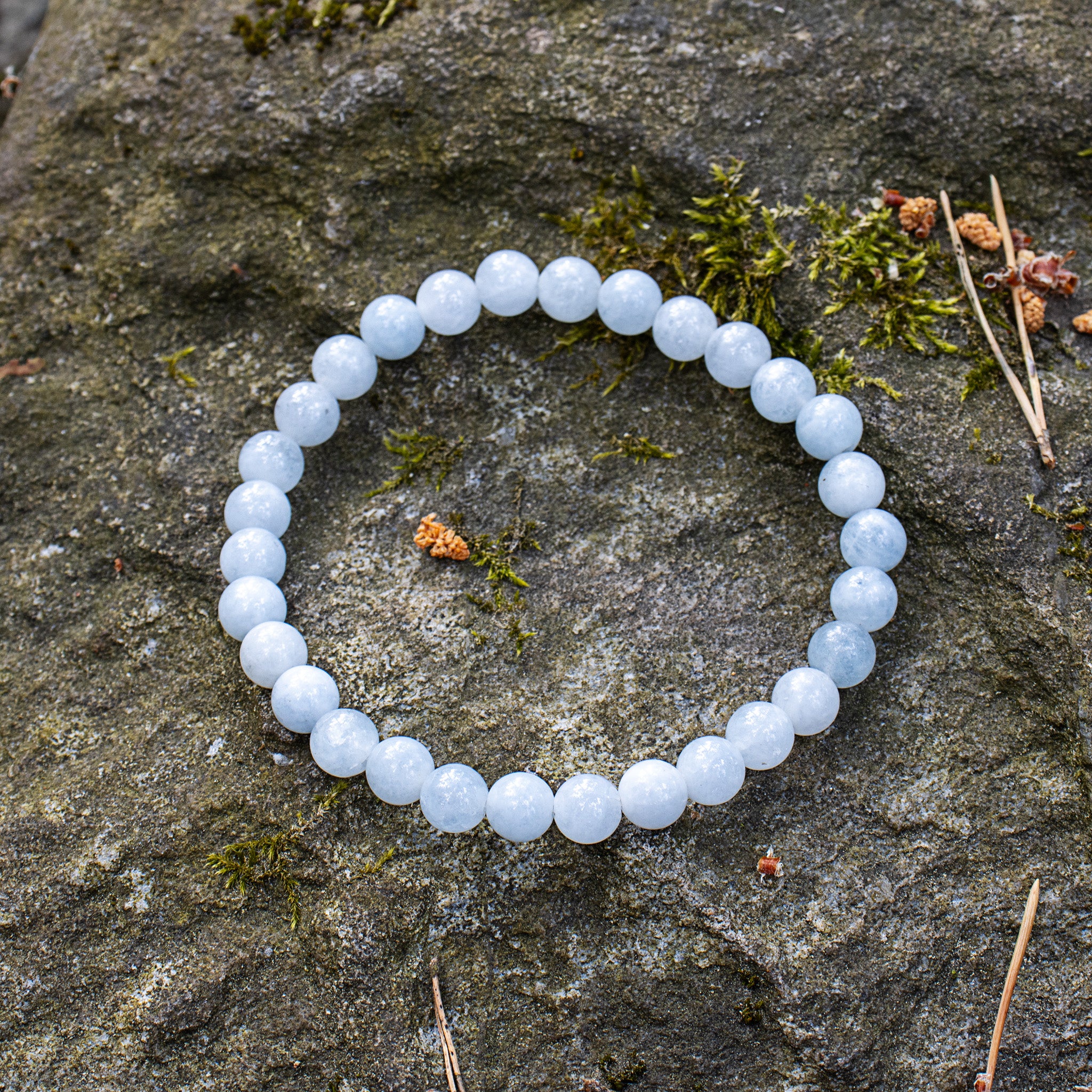 • 6 mm high quality genuine Aquamarine gemstone beads, matching color plastic screw clasp closure.