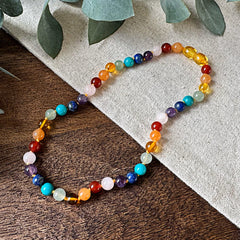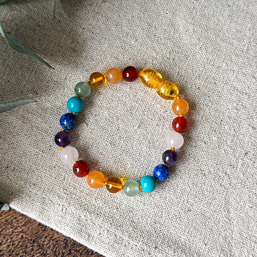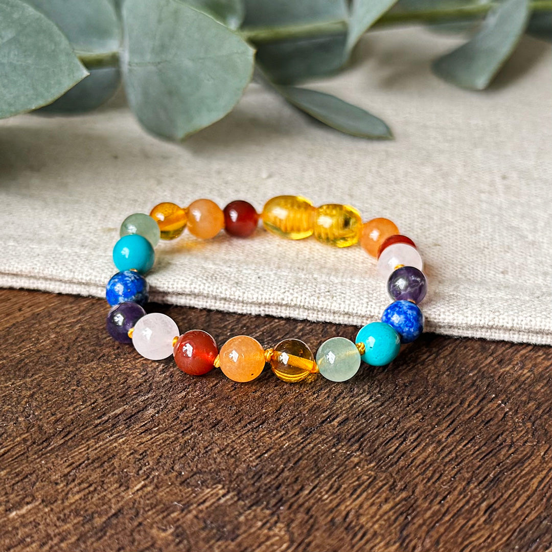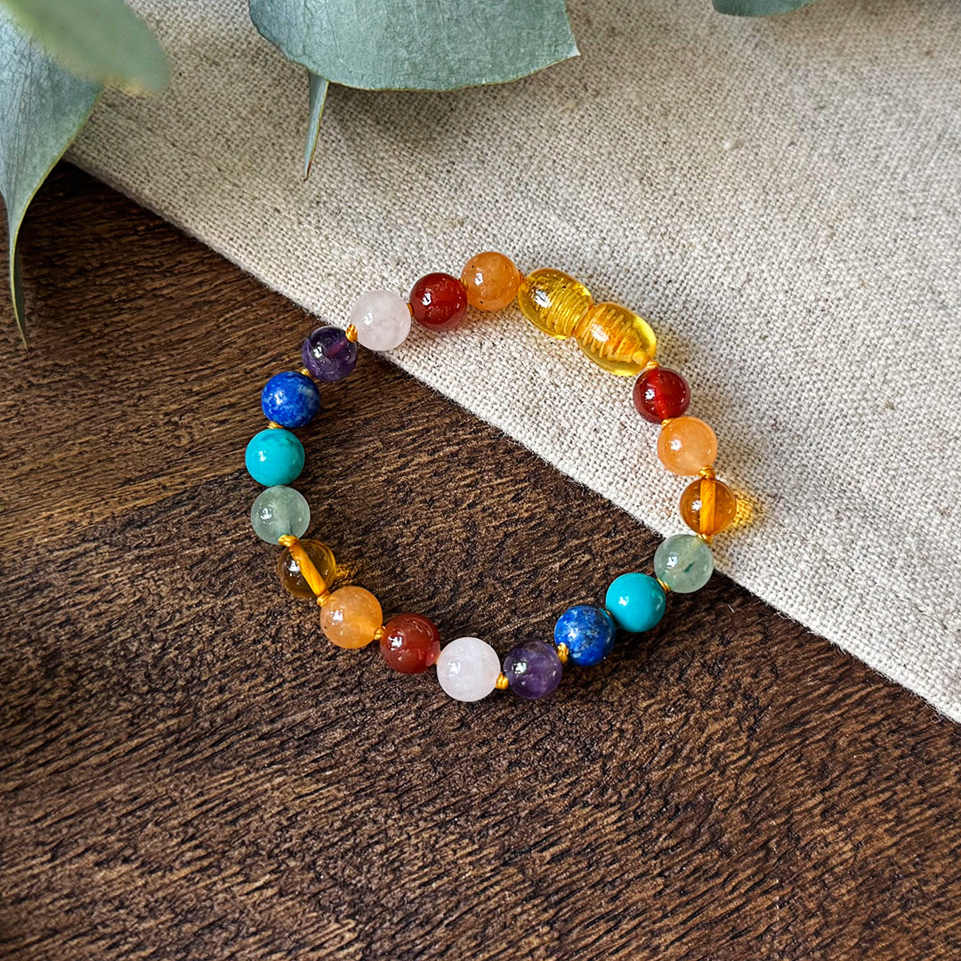 Chakra Rainbow gemstones bracelet with Baltic amber