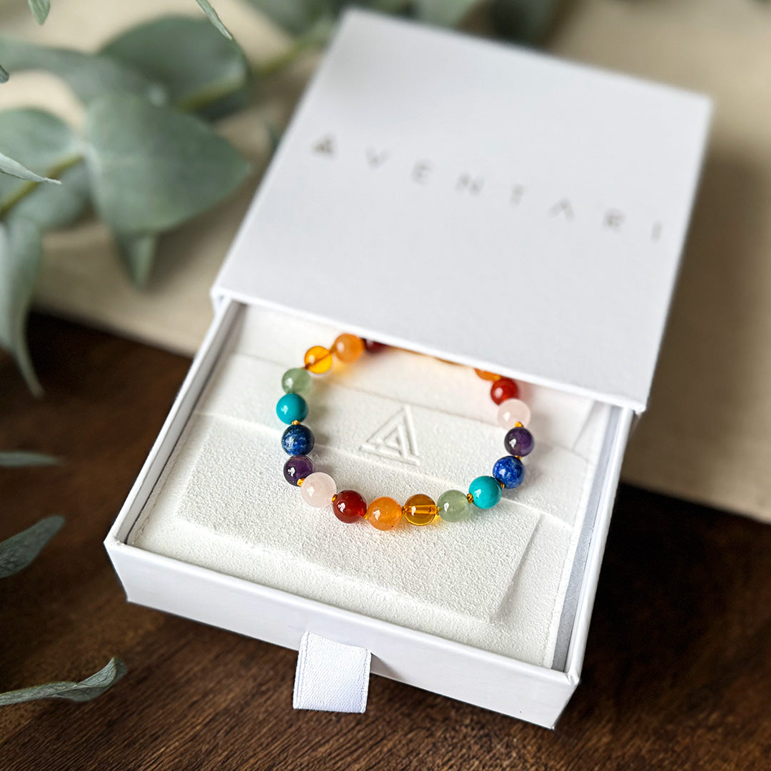• Each stone corresponds to a specific chakra: Red Agate (Root), Baltic Amber (Sacral), Orange Aventurine (Solar Plexus), Green Aventurine (Heart), Turquoise (Throat), Lapis Lazuli (Third Eye), and Amethyst (Crown).