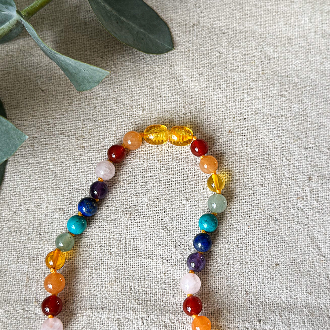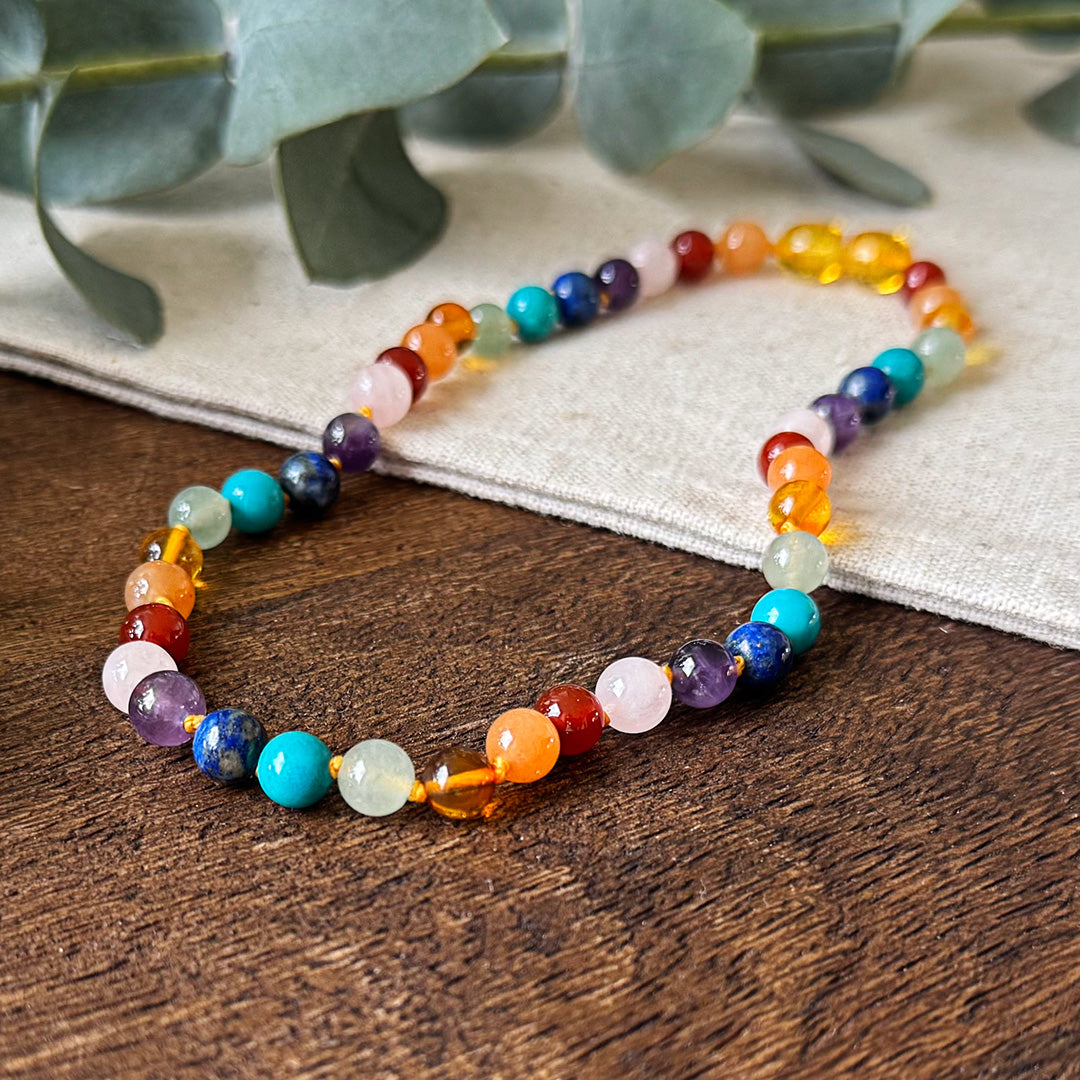 • Each stone corresponds to a specific chakra: Red Agate (Root), Baltic Amber (Sacral), Orange Aventurine (Solar Plexus), Green Aventurine (Heart), Turquoise (Throat), Lapis Lazuli (Third Eye), and Amethyst (Crown).