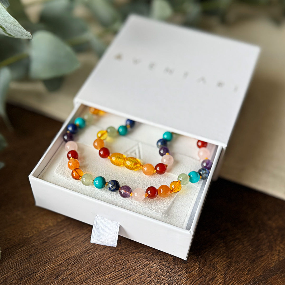 I ordered the Chakra Rainbow bracelet and necklace set to match with my 8-year-old daughter. The colors are absolutely stunning - so vibrant and carefully arranged. We love wearing them! The quality is excellent and they've held up beautifully through daily wear. Highly recommend for any parent wanting to create special matching moments!