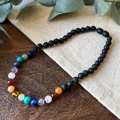 Seven gemstones set against volcanic lava rock, each 6 mm, strung on a resilient elastic band and finished by hand in our Lithuanian atelier. The matte black of cooled basalt frames red agate, Baltic amber, orange aventurine, amazonite, turquoise, lapis lazuli, and amethyst — a full spectrum held together by the raw texture of volcanic stone. Presented in Aventari signature packaging.