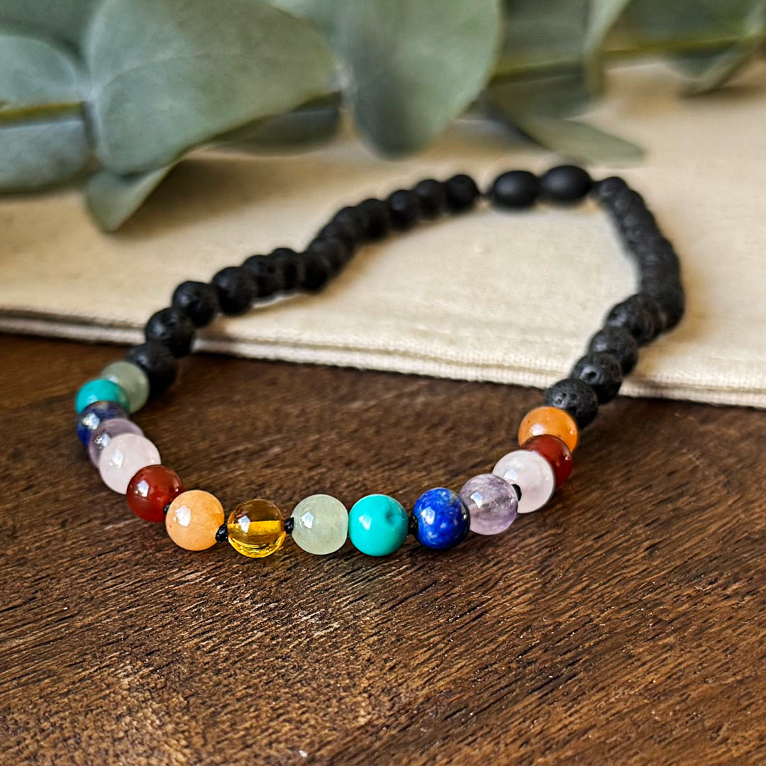 • Each stone corresponds to a specific chakra: Red Agate (Root), Baltic Amber (Sacral), Orange Aventurine (Solar Plexus), Amazonite (Heart), Turquoise (Throat), Lapis Lazuli (Third Eye), and Amethyst (Crown).
