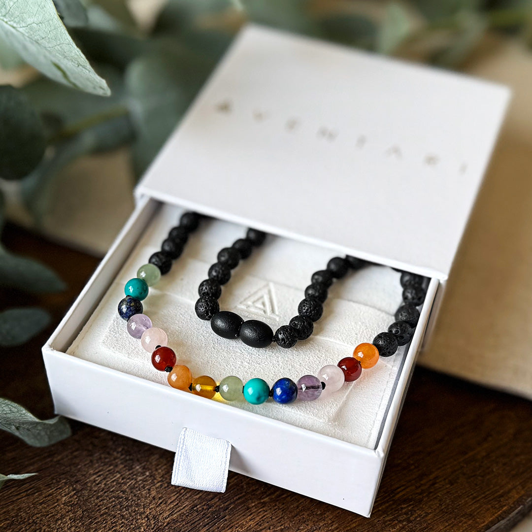 I ordered the Chakra Rainbow bracelet and necklace set to match with my 8-year-old daughter. The colors are absolutely stunning - so vibrant and carefully arranged. We love wearing them! The quality is excellent and they've held up beautifully through daily wear. Highly recommend for any parent wanting to create special matching moments!