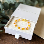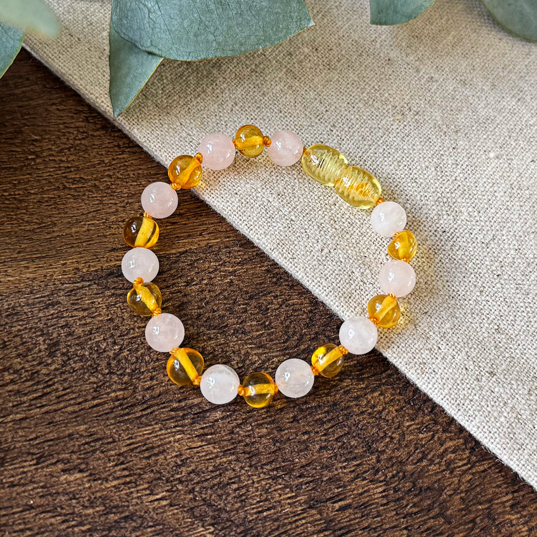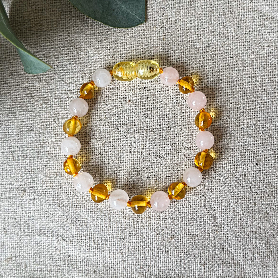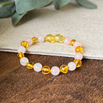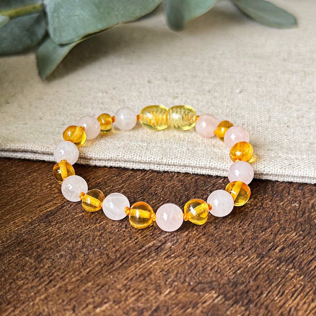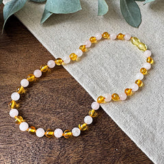 • High quality genuine Lemon Baltic Amber and Rose Quartz gemstone beads arranged in a harmonious pattern, with matching color plastic screw clasp closure.