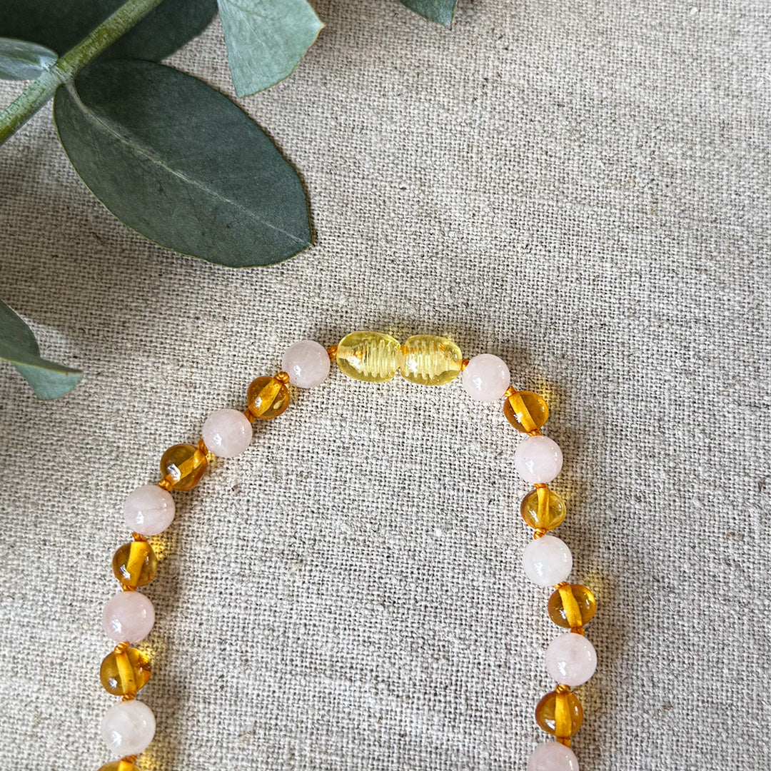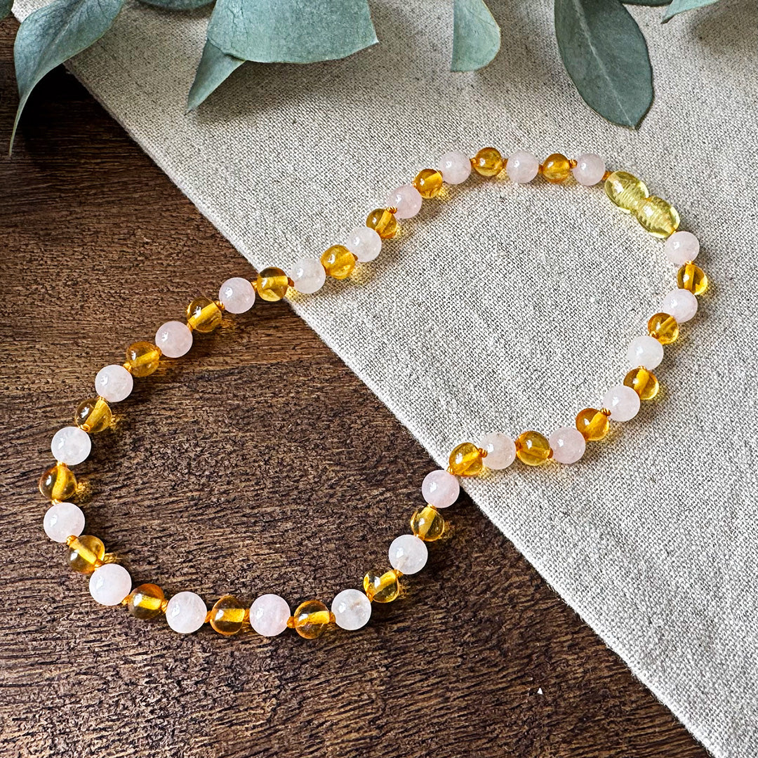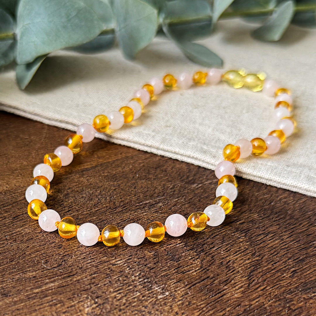 - High quality genuine Lemon Baltic Amber and Rose Quartz gemstone beads arranged in a harmonious pattern, with matching color plastic screw clasp closure.