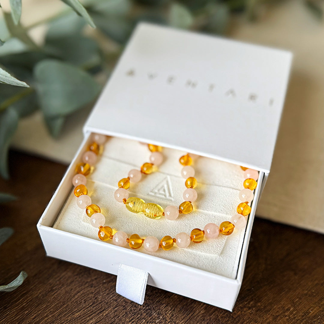 - Zodiac signs: Leo, Taurus (Baltic Amber); Taurus, Libra (Rose Quartz).