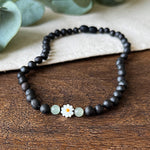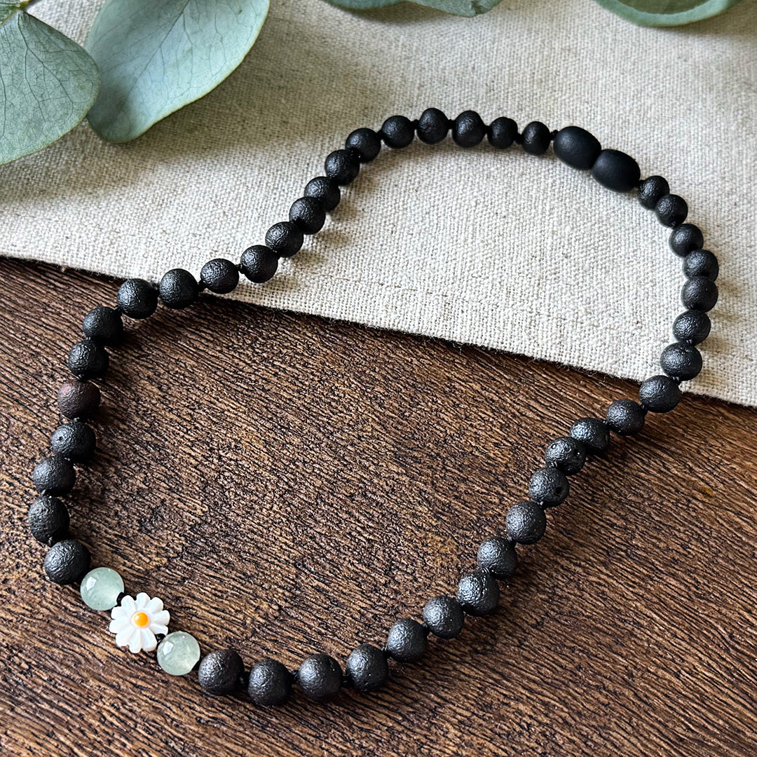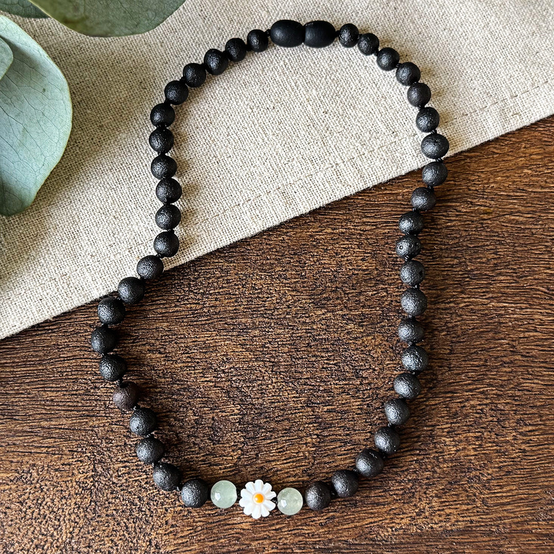 Raw Cherry Baltic amber necklace with Freshwater Shell Flower & Green Aventurine