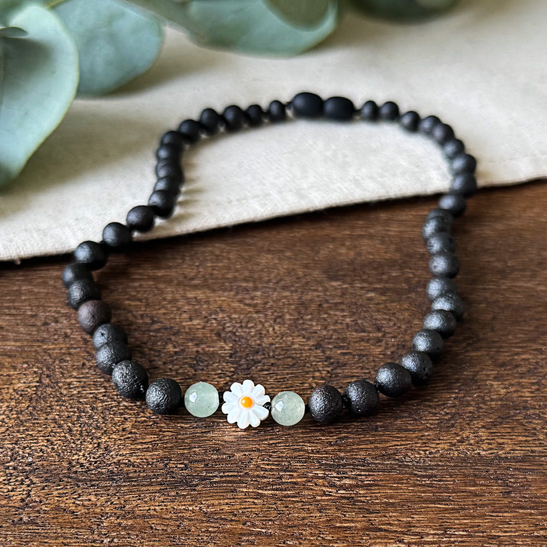 - Embrace ancient wisdom with this captivating handcrafted necklace featuring raw Cherry Baltic amber, delicate freshwater shell flower, and prosperity-attracting Green Aventurine.