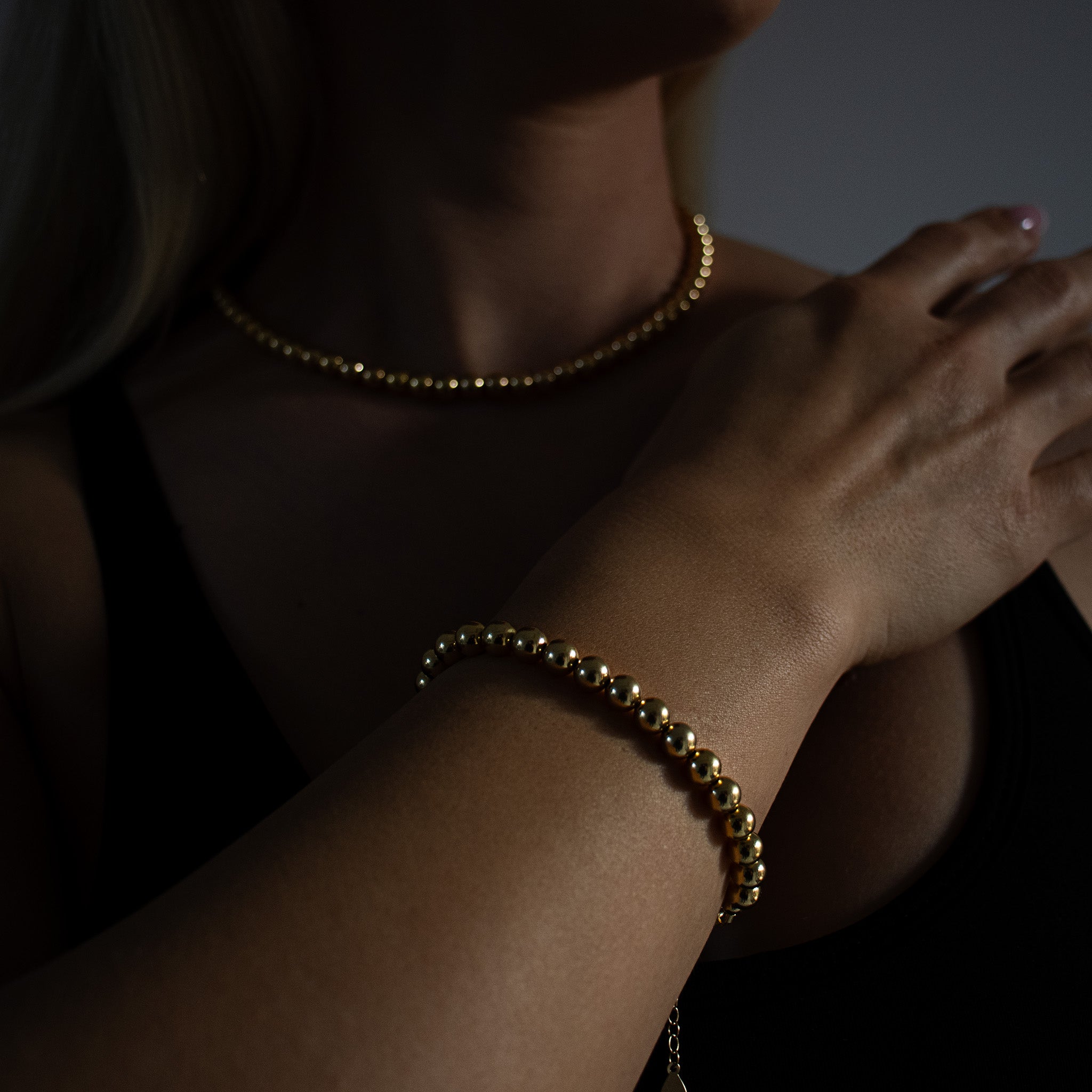 - 6 mm high quality metal beads, available in Sterling Silver, 18K Gold, or 18K Rose Gold plating, with matching lobster clasp closure.
